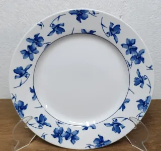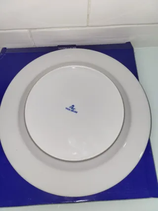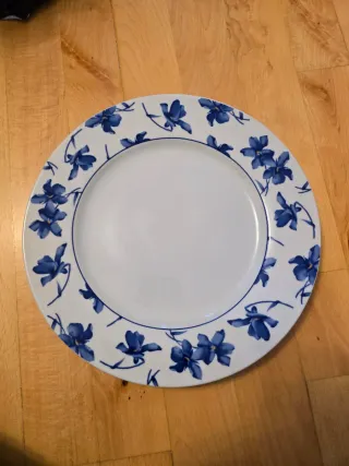 Plato llano de la marca Vista Alegre, con un bonito diseño floral en tonos azules sobre fondo blanco. Es nuevo y se entrega en su caja original. - Diámetro: 28 cm. - Material: Porcelana. Dispongo de 10 unidades