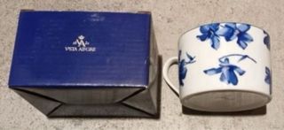 Elegante taza de consomé con su plato a juego, modelo Viana de Vista Alegre. Presenta un diseño floral (diferente en cada lado) en tonos azules y amarillos sobre fondo blanco. - Diseño floral detallado. - Incluye plato a juego. - Sin estrenar (conserva la etiqueta) Si quisieran la pareja, hay otro vendedor en esta misma plataforma que ofrece la misma taza (pero a 20€)