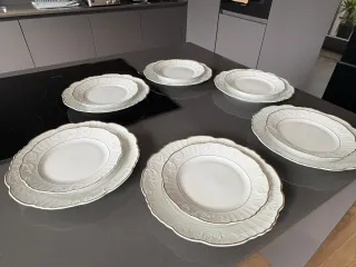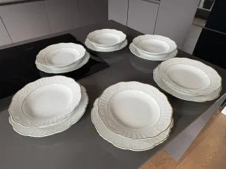 Preciosa vajilla de porcelana blanca con detalles dorados y un delicado diseño floral. - Vajilla nueva, sin uso. - Acabado con borde dorado. - Diseño floral sutil.completa