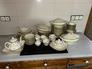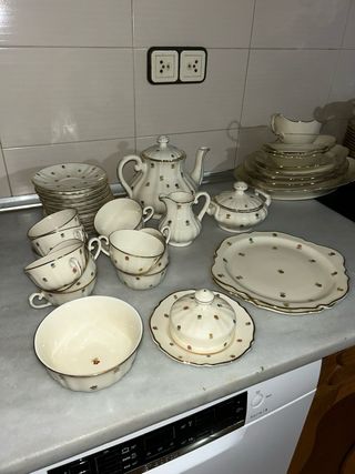 Elegante vajilla en fina porcelana de la prestigiosa firma portuguesa EMA Vista Alegre Portugal,de 12 comensales. Un conjunto clásico con detalles dorados y adornos florales muy sutiles,que aportará distinción a tu mesa,satisfará los gustos más exigentes.Ideal para regalar,Nueva sin estrenar. Impecable.Consta de 84 piezas numeradas.Juego de café completo,cafetera/tetera,lechera, azucarero y 12 tazas con sus correspondientes platos,3 fuentes:1llana,1ovalada y 1 ensaladera,sopera y salsera con sus platos correspondientes,2 entremeseras,24 platos llanos,12 hondos y 12 de postre. - Piezas con borde dorado - Diseño elegante floral.