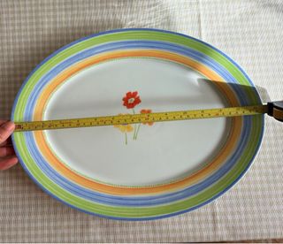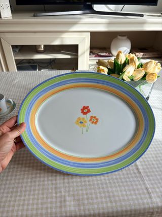 Preciosa bandeja ovalada de Vista Alegre con un diseño alegre de flores. - Borde decorado con rayas de colores. - Centro con un delicado motivo floral.