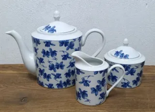Elegante juego de té de porcelana con un delicado diseño floral en azul y blanco. - Incluye tetera, azucarero, lechera, tazas y platillos. - Piezas con un bonito estampado de flores azules. - Material: Porcelana de alta calidad.