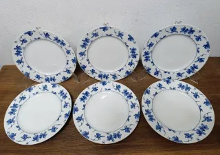 Conjunto de seis platos de la reconocida marca Vista Alegre, con un delicado diseño floral en tonos azules sobre fondo blanco. - Diseño floral azul. - Borde decorado. Muy bueno estado.