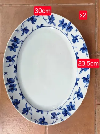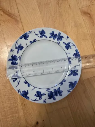 Conjunto de platos con un delicado diseño floral en tonos azules. - Borde decorado con flores azules pintadas a mano. - Diseño clásico y elegante. - Pieza de porcelana de alta calidad.