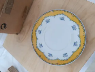 Pieza de vajilla con un diseño floral en tonos azules sobre un borde amarillo. Todo 350. Por separado preguntar precio. 24 platos llanos. 12 soperos 2 bandejas ovaladas. 1 bandeja redonda. 1 salsera. 1 sopera. - Diseño floral azul. - Borde decorativo amarillo.