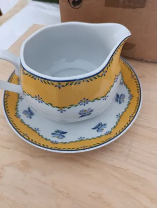 Elegante salsera de la marca Vista Alegre con un diseño alegre. - Diseño con flor amarilla y hojas verdes sobre fondo naranja. - Borde superior blanco con una fina línea azul. - Asa blanca con detalles en azul y rojo.