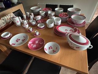 Elegante vajilla con un delicado diseño de flores rosas sobre fondo blanco. - Incluye para 12 personas: juego de platos, tazas, fuentes, sopera, juego de café - Acabado brillante.
