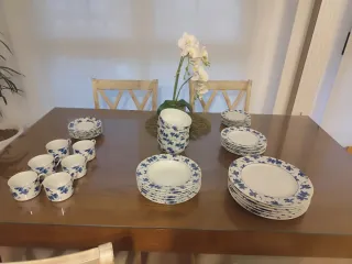 Elegante vajilla de porcelana con un delicado diseño floral en tonos azules sobre fondo blanco. Ideal para añadir un toque de distinción a tu mesa. - Juego de té completo. - Incluye tetera, azucarero y tazas. - 4 tazones y 4 tazas de te - 6 platos llanos. - 4 platos postre. - bandeja.