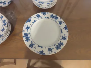 Elegante vajilla de porcelana con un delicado diseño de flores azules sobre fondo blanco. Un conjunto clásico y bonito para cualquier ocasión. - Diseño de flores azules. - Material de porcelana. - Marca Vista Alegre. (SE VENDE LA VAJILLA AL COMPLETO)