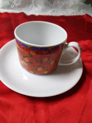 Elegante servicio de café de VISTA ALEGRE. Taza y plato para COLECIONISMO - Porcelana. - Diseño con flores amarillas sobre fondo rojo. - Borde decorativo azul y dorado.