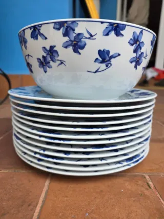 Vajilla porcelana Vista Alegre: 12 platos + ensaladera + 2 fuente. Decoración floral. Perfecto estado. No envíos, solo recogida.