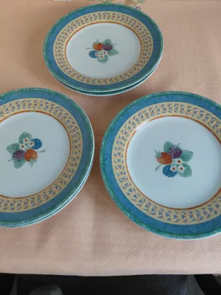Conjunto de seis platos de la marca Vista Alegre con un bonito diseño de frutas. - Cada plato tiene un borde decorado con motivos geométricos en tonos azules y amarillos. - El centro de cada plato presenta una ilustración de bayas y fresas. Serie del Bosco Diametro 17,5cm