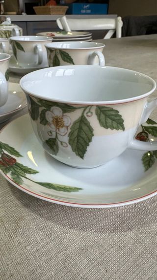 Precioso juego de café de la marca VISTA ALEGRE, hecho de porcelana. El juego incluye una jarra de leche y 9 tazas con sus platos. Las piezas presentan un diseño encantador con cerezas. Son ideales para disfrutar de un café con estilo. - Jarra cremera y taza con plato - Diseño con cerezas - Perfecto estado
