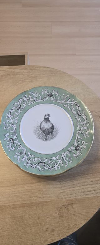 Conjunto de platos Duquesa Alba con un diseño elegante. Marca Vista Alegre - Borde decorado con motivos vegetales en verde y blanco. - Imagen central de un ave en tonos grises.