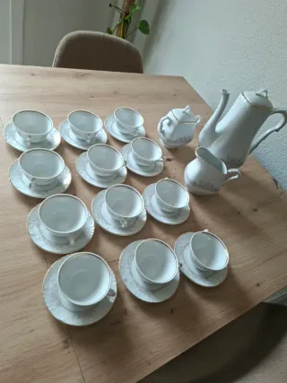 Elegante juego de café de porcelana blanca con delicados detalles florales y ribetes dorados. - Incluye tetera, azucarero y lechera. - Seis tazas con sus respectivos platillos. Portuguesa vista Alegre