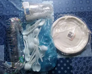 6 platos, 3 vasos largos, 5 vasos anchos, y 38 cucharas de plástico, comprados en el Corte Ingles, de un solo uso bien para camping o celebraciones... vendo por no uso, urge venta por jubilación y pre mudanza, precio negociable