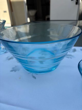 Preciosa vajilla de cristal azul. Ideal para darle un toque de color a tu mesa. - Incluye 6 cuencos pequeños, 6 copas y 1 ensaladera. - Piezas elegantes y translúcidas. - Perfectas para servir postres o aperitivos.