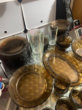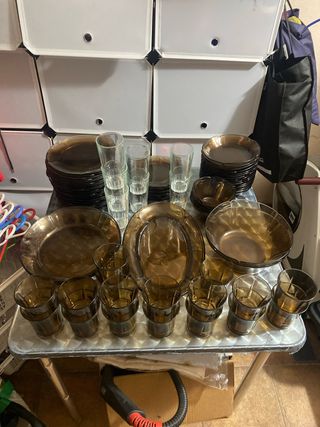 Conjunto de vajilla Duralex de estilo vintage. Piezas elegantes en tonos marrones y transparentes. - Platos llanos: 21 -Platos hondos: 15 -Platos pequeños: 9 -Ensaladera: 2 -Bol: 4 -Bol grande: 2 -Bandeja: 2 -Vasos: 17 -Vasos largos (incluido en el lote): 7