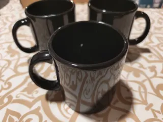 Conjunto de tres tazas de cerámica en color negro. Cada taza tiene un diseño grabado sutil. - Tres tazas incluidas en el set. - Diseño grabado en relieve.