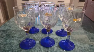 Set de seis copas de cristal con base y tallo en color azul. - Diseño con relieve. - Detalle dorado en la unión del tallo con la copa. - Etiqueta de la marca 'Cristal Mode' visible.