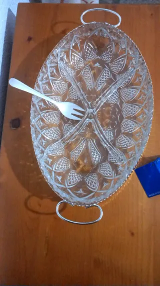Elegante bandeja para aperitivos de The Windsor Range, parte de la colección Mayfair. Ideal para servir tus platillos favoritos con estilo. - Diseño intrincado en metal plateado. - Cuenco central de cristal tallado. - Incluye tenedor. - Es un regalo que nunca se ha usado.