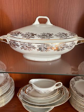 Elegante vajilla completa de porcelana con detalles dorados. Servicio para 12 personas: - 24 platos llanos - 12 platos hondos - 12 platos de postre - 1 fuente grande - 2 fuentes medianas - 2 fuentes pequeñas - Sopera -Ensaladera - Salsera -12 pocillos con sus platillos - Cafetera - Azucarera - Jarra de leche