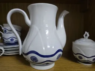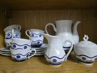 Elegante juego de café de porcelana con un diseño distintivo. - Incluye 7 servicios completos. - Decoración con motivos azules y blancos. - Piezas de porcelana de alta calidad.