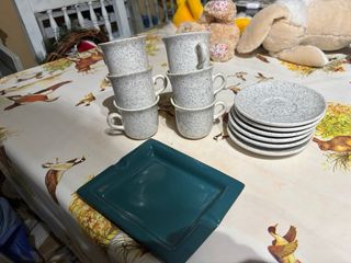 Juego de café y cenicero. Ideal para amantes del café clásico. - 6 tazas de café apilables con un diseño elegante y moteado. - 6 platillos a juego, también con diseño moteado. - 1 cenicero cuadrado de color verde oscuro.