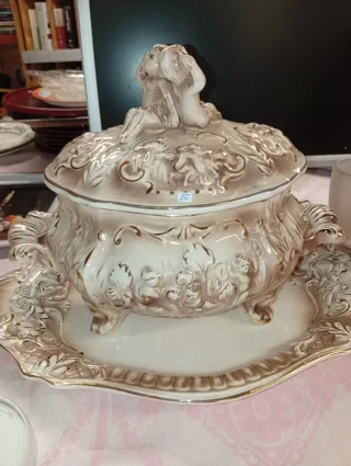 Elegante sopera de cerámica con un diseño detallado y acabados dorados. - Piezas con relieve. - Incluye plato. - Tapa con figura decorativa.