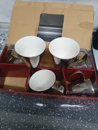 Elegante set de tazas con un acabado plateado texturizado. - Diseño moderno y llamativo. - Ideales para café o leche. - Incluye 6 tazas.