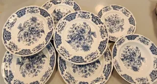 Elegante juego de platos con un diseño floral y de aves en tonos azules sobre fondo blanco. - Set de 7 platos. - Diseño clásico y detallado. - Borde festoneado. - 10 euros unidad o 50 euros el lote