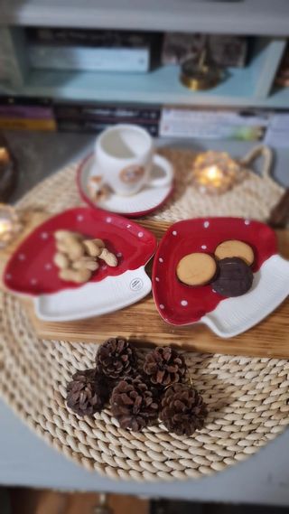 Conjunto de dos platos decorativos con forma de seta. Perfectos para servir aperitivos o dulces. - Diseño de seta con lunares blancos. - Base blanca con relieve.