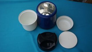Termo para comida en color azul, con tapa negra y recipiente interior blanco, tiene varias zonas. Es perfecto para llevar tu comida a cualquier parte. Termos sin uso, el negro de un litro 34 cm y el azul mide 21 cm de alto y 15 cm de diámetro, precio por unidad, entregó en mano o envío tengo más cosas a la venta mirar mi perfil gracias
