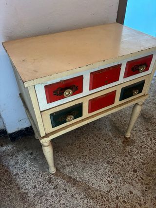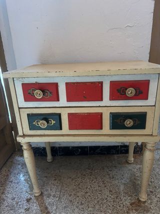 Mesita auxiliar antigua con un diseño encantador y detalles coloridos. - Dos cajones frontales. - Tiradores dorados. - Patas cónicas.