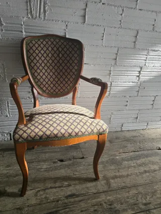 Bonito sillón clásico de madera maciza con respaldo envolvente, brazos curvados y asiento amplio. Tapizado original con dibujo geométrico en tonos cálidos, muy decorativo y con personalidad. Una pieza elegante y cómoda, perfecta para salón, despacho, dormitorio o proyecto decorativo. Aporta carácter sin resultar pesada. ✨ Detalles Estilo: clásico francés / Luis XV Época: mediados del siglo XX Material: madera maciza Tapicería original en buen estado general Estructura firme y estable Sillón cómodo, con buena proporción Faltan algunas fotos de detalle, pero se puede ver sin problema el estado general. Puedo enviar más si hace falta