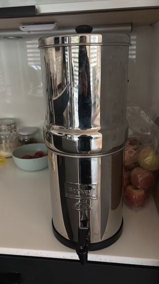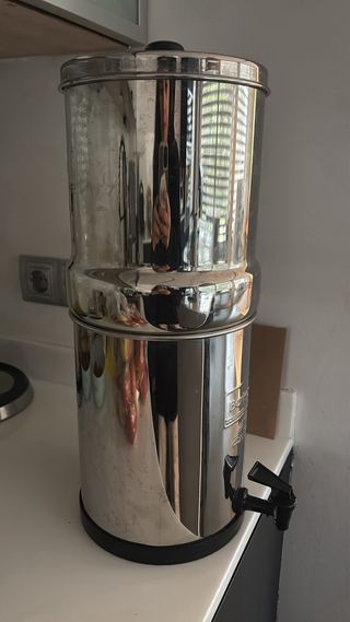 Sistema de filtración de agua Berkey con una capacidad de 5.7 litros. Filtros originales usados menos de 4 meses (nos transladamos). - Fabricado en metal y plástico. - Diseño elegante en color plateado y negro.