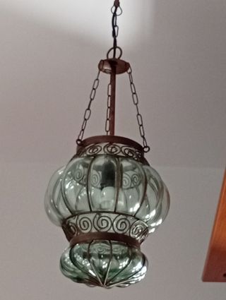 Lampara de habitación, con tulipa de cristal y capacidad 3 bombillas. Diámetro tulipa: 30 cm Diámetro total: 32 cm Largo lámpara sin tener en cuenta la cadena: 55 cm aproximadamente.
