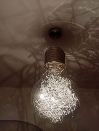 Preciosa lámpara de diseño moderno. Se trata de una pieza única que dará un toque especial a cualquier espacio. - Forma de bombilla de cristal transparente. - Elemento decorativo interior metálico plateado. Contorno bombilla: 48 y 90 cm