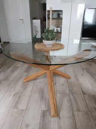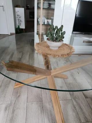 Elegante mesa redonda con sobre de cristal y base de madera. - Diseño moderno y minimalista. - Patas de madera maciza con un diseño cruzado. - Superficie de cristal transparente.