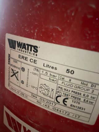 Vaso de expansión de 50 litros, ideal para sistemas de calefacción o agua.membrana nueva. - Capacidad: 50 litros. - Color: Rojo. - Conexión roscada.