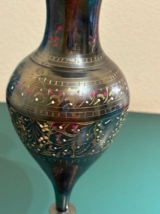 Precioso jarrón de estilo oriental con un diseño detallado y elegante. - Decorado con escenas y figuras. - Asas laterales doradas. - Acabado multicolor. Medidas 26 cms de alto por 24 cms de ancho( en la parte de las asas)