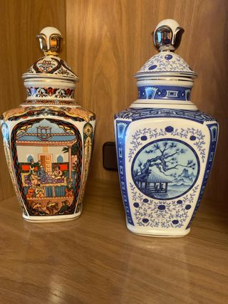Precioso jarrón de cerámica con un diseño oriental. - Motivos de paisajes y figuras tradicionales. - Acabado brillante con detalles dorados.