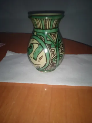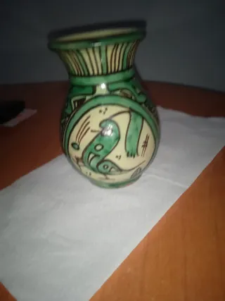 Precioso jarrón antiguo con un diseño único. - Elaborado en cerámica. - Tonos beige y verde con detalles pintados a mano. - Pieza decorativa con estilo.
