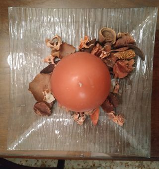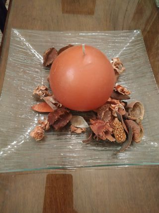 Elegante centro de mesa de cristal con un diseño decorativo. Perfecto para añadir un toque de color y estilo a cualquier espacio. - Base de cristal transparente con textura. - Incluye elementos decorativos secos y una vela redonda de color naranja.