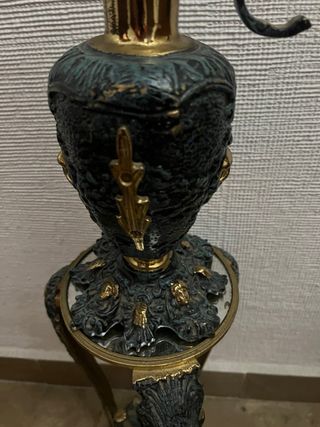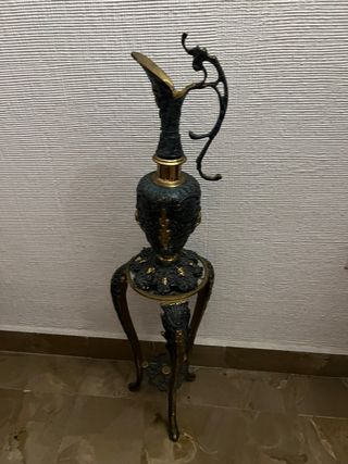 Elegante jarra decorativa tipo aguamanil, original de Port. Su diseño intrincado y acabados le dan un toque de distinción. - Fabricada en metal con detalles en dorado y azul - Diseño ornamental. - Ideal como pieza de acento.