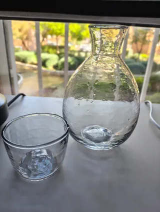 Set de noche para agua, compuesto por una jarra y un vaso. El vaso impide que le entre polvo al agua. - Diseño de vidrio. - El vaso se acopla a la jarra para guardarlo. Cómo nuevo, es de Zarahome Mide unos 17cm de alto