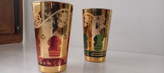 Dos vasos para té. De cristal, uno rojo y otro verde con dorado