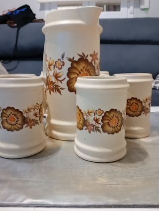 Conjunto color caramelo vintage , incluye botella de licor(vacía), tres copas para licor, tres para cha mpán y nueve vasos altos