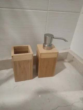 Set de jabonera y vaso con un diseño moderno y natural. Nuevo a estrenar. - Fabricado en bambú y metal. - Acabado en tonos marrones y plateados.