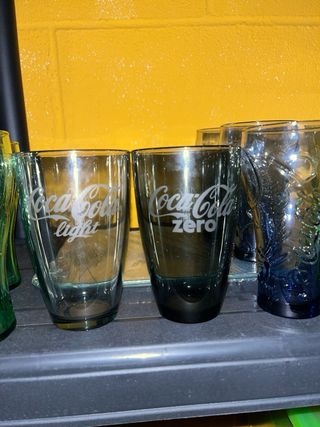 11 vasos de coca cola de distintos colores y forfa escucho ofertas